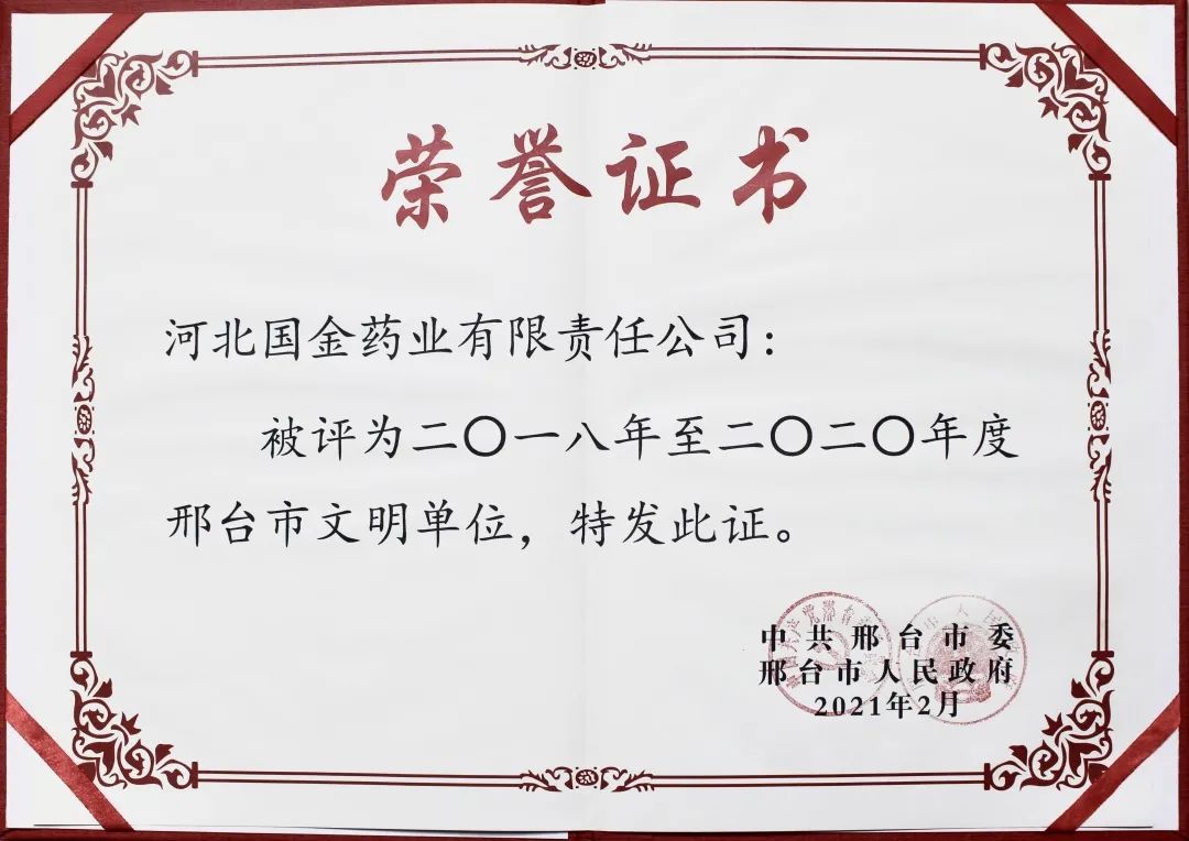近日,國金藥業榮獲了由中共邢臺市委、邢臺市人民政府授予的市級文明單位榮譽稱號,這標志著公司文明創建工作再獲新成效。